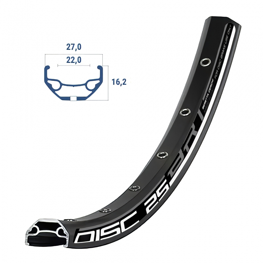 Janta Beretta Disc-27E este destinată roților de 29" (ETRTO 622) și este realizată din aluminiu cu construcție dublu perete. Are finisaj anodizat negru și găuri pentru spițe nituite pentru rezistență sporită. Varianta cu 36 de găuri (36H), compatibilă exclusiv cu frâne pe disc (nu este potrivită pentru frâne pe jantă). Lățime interioară: 22 mm, lățime exterioară: 27 mm. Greutate: 560 g, diametru orificiu valvă: 8,5 mm.