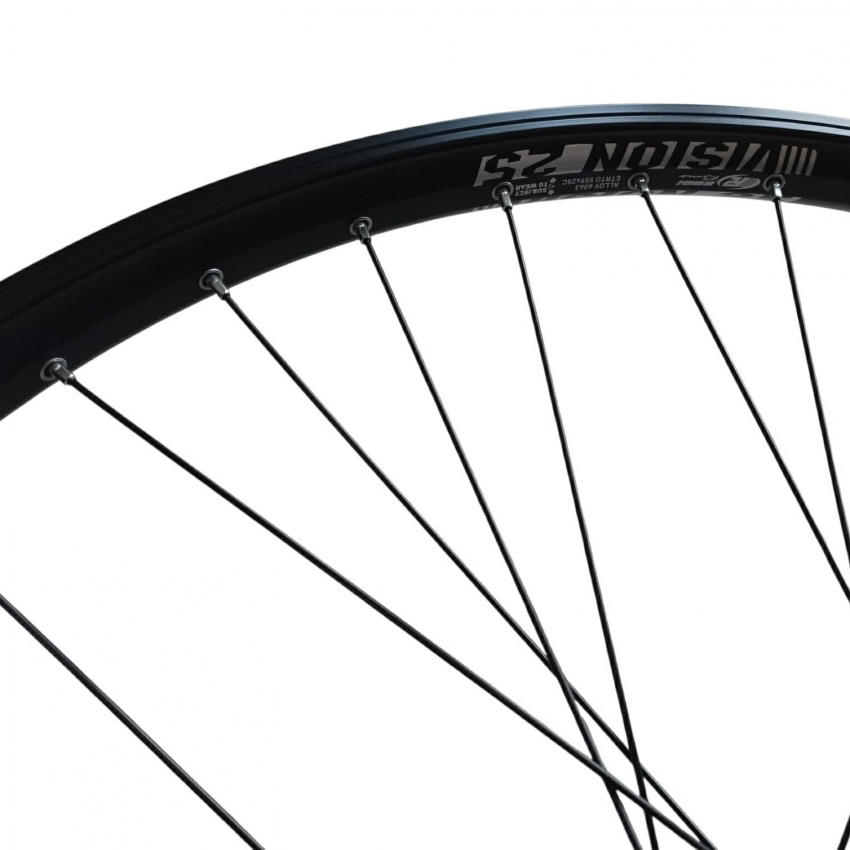 Roată față de 26" cu frână pe disc, echipată cu jantă Rodi Vision cu găuri pentru spițe nituite, pentru rezistență sporită.