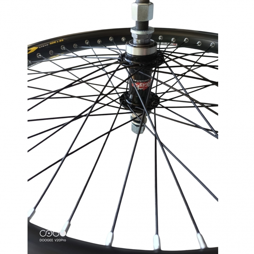 -acest set de roată BMX de 20" combină janta Remerx Jumbo cu perete dublu, lățime de 23 mm și 48 de găuri, cu butucul spate robust Novatec 48H