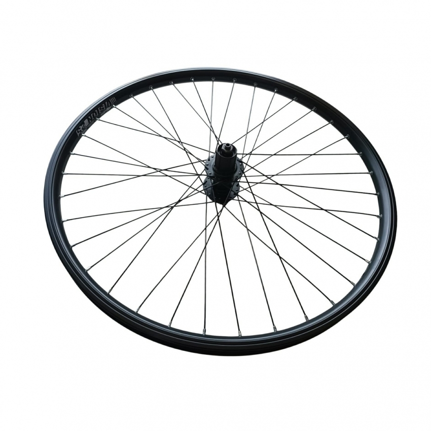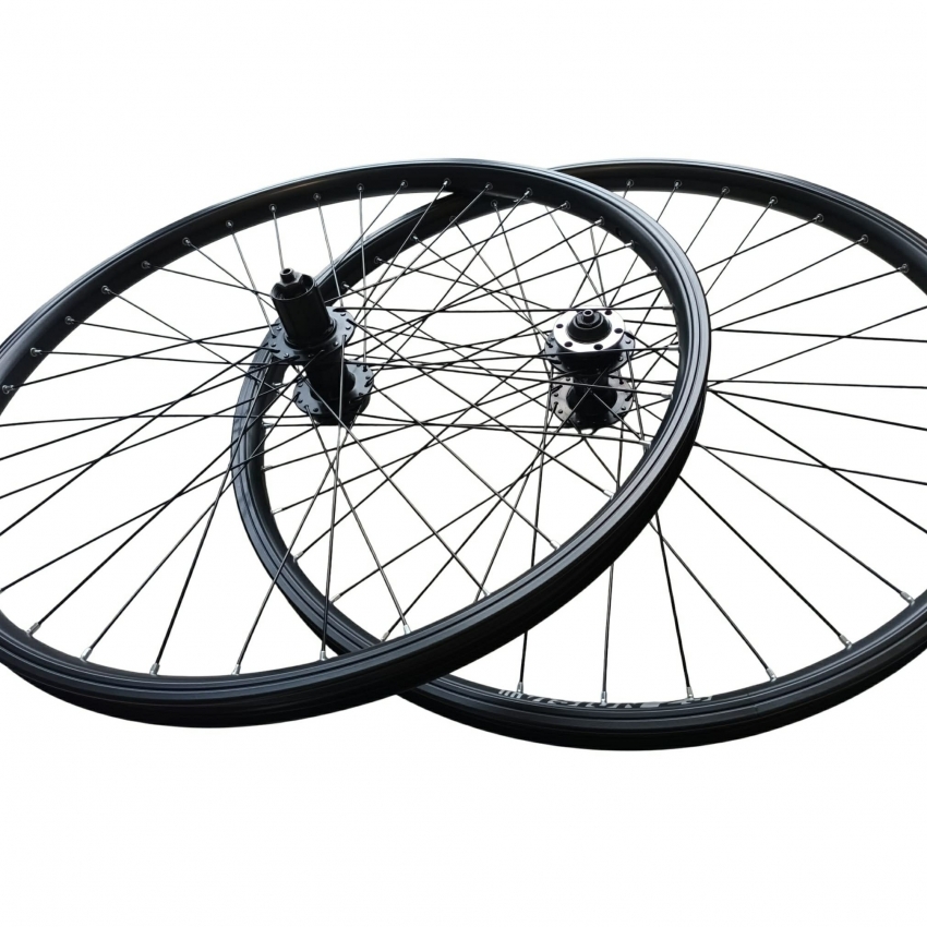 Set de roți 26" pentru frână pe disc, echipat cu găuri pentru spițe nituite, pentru rezistență sporită. Roata spate are butuc cu casetă compatibil cu pinioane de 7, 8 și 9 viteze, iar roata față este dotată cu butuc pentru disc cu prindere în 6 șuruburi. Dimensiuni jantă: diametru 559, lățime interioară 25 mm (exterior 30,8 mm). Compatibil exclusiv cu frâne pe disc, ideal pentru biciclete MTB și de oraș.